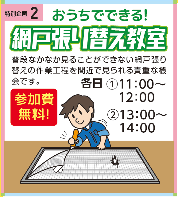 網戸張り替え教室を午前と午後1時間ずつ、開催しております!