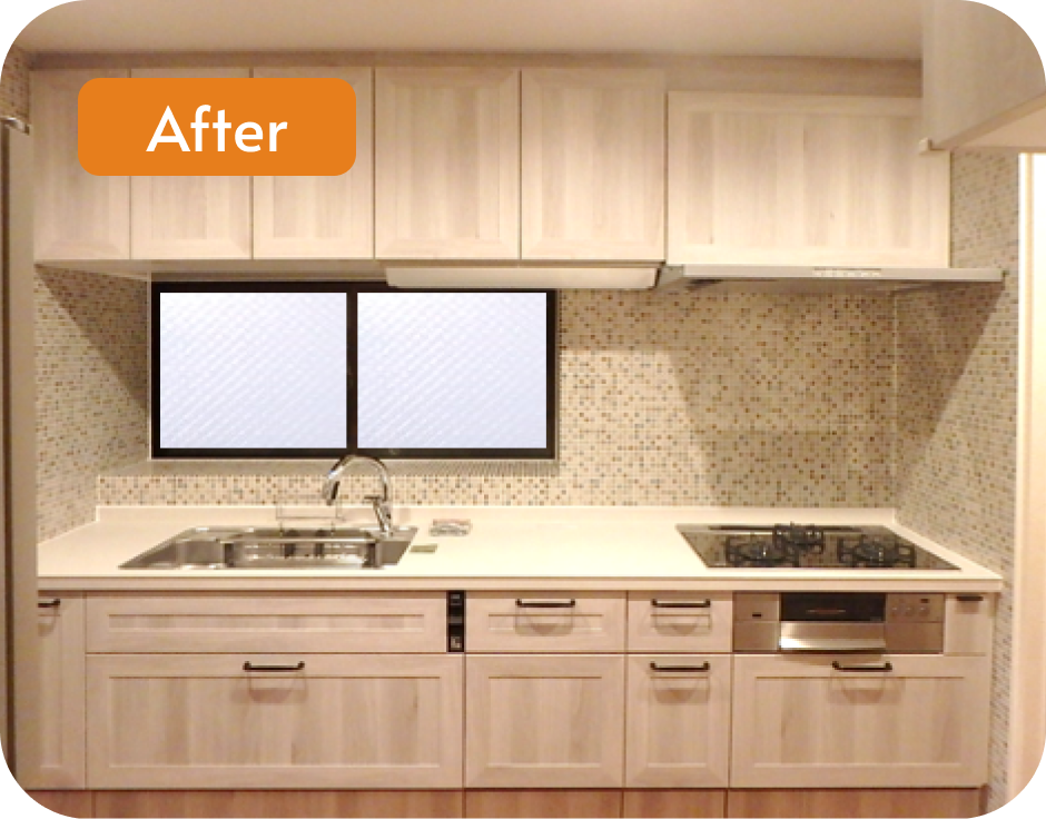 人気のグレー系の木目調キッチン扉と合わせたことで北欧風な空間になりました。