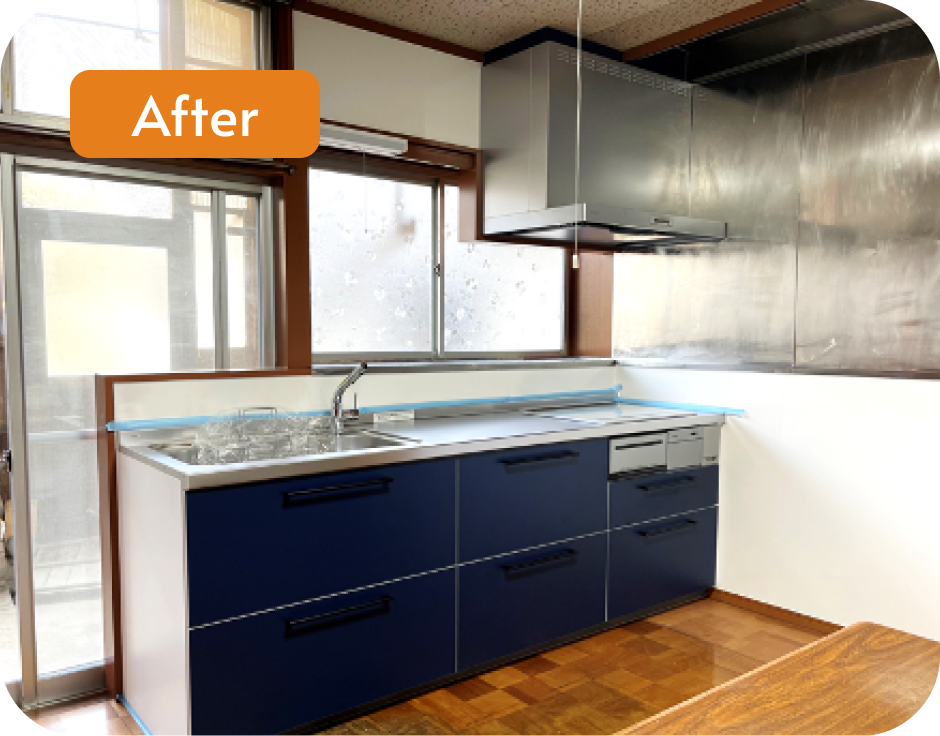 そこで掃き出し窓の室内側に腰壁をつくり、標準サイズである2.4mのI型キッチンを設置しました。腰窓があっても外への出入りや施錠は可能です。明るい窓際で広々と料理が出来るようになりました。