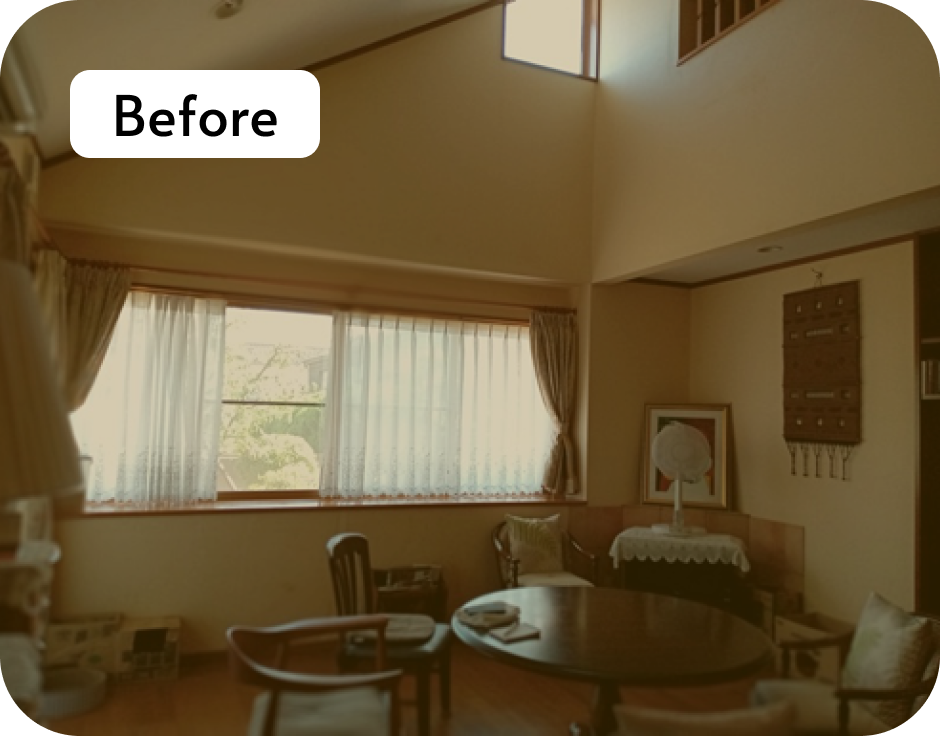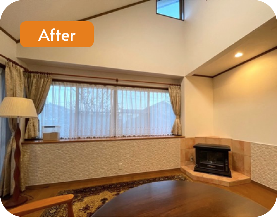 内装は壁紙の貼替にプラスして暖炉周りに内装装飾ボードを貼り付けました。暖色のタイル柄がエレガントなお家の雰囲気にマッチしています。