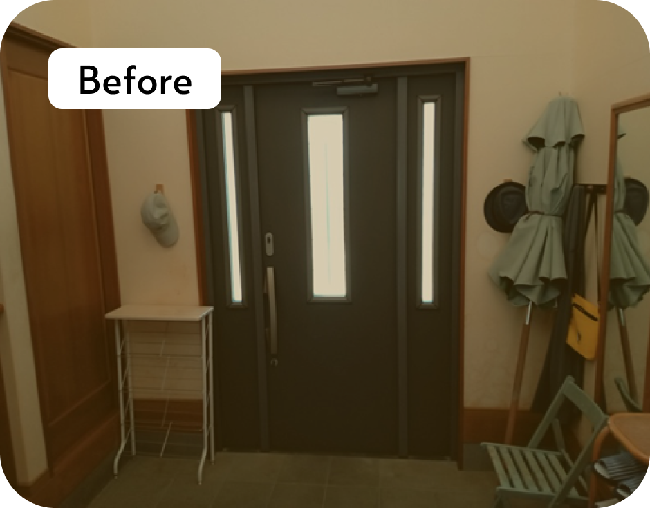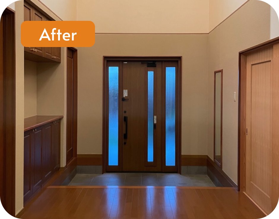 玄関周りは湿気の影響で壁紙にシミが目立っていました。そこで、調湿効果のある珪藻土塗装をご提案しました。シミの原因である湿気を防ぎ、1年中カラッとした空気を保ちます。