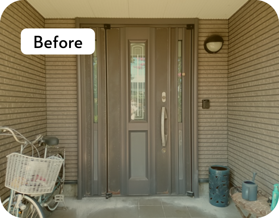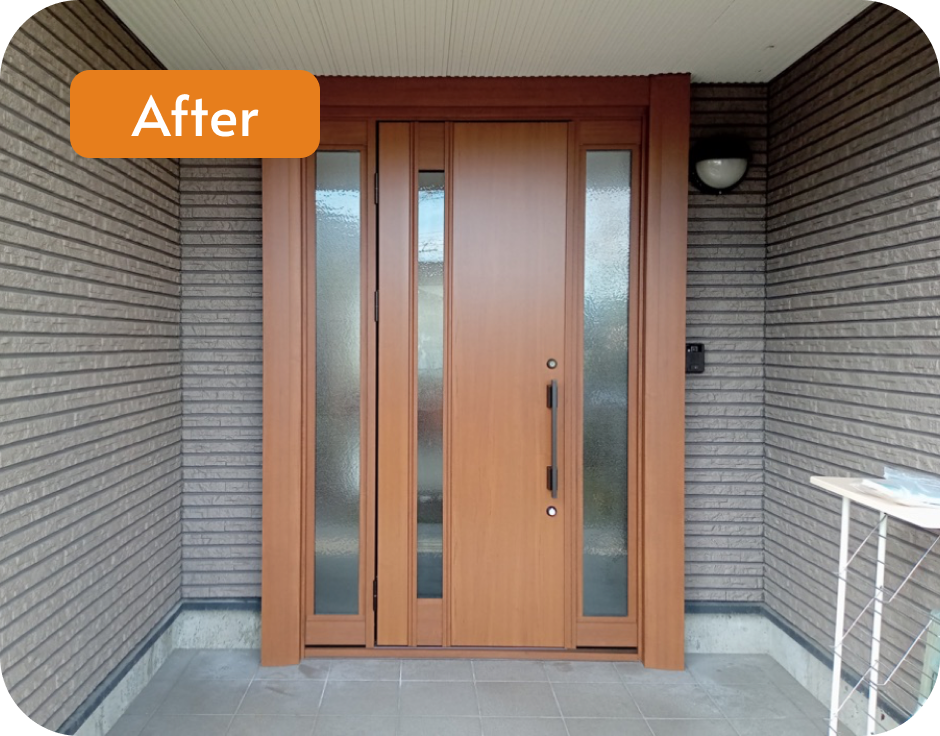 グレーの玄関ドアから暖かみ感じる木目調の玄関ドアに変わりました。工事はたった1日で終わります。
