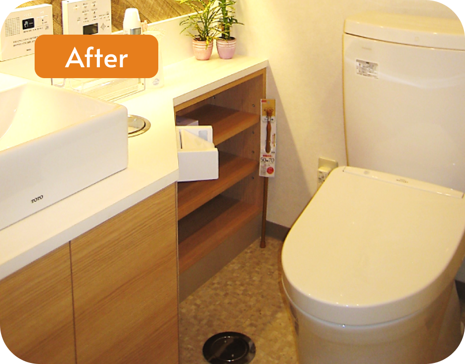 店内だけでなく、トイレの中まで快適に過ごしてほしいと隅々までこだわりが詰まっています。 トイレは和式から洋式に変わっただけではなく、 廊下にあった手洗いをトイレの中に設けました。 暗かったトイレが鏡の間接照明も加わり明るい空間へと変わりました。