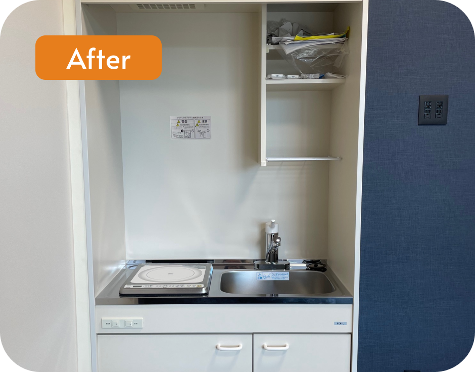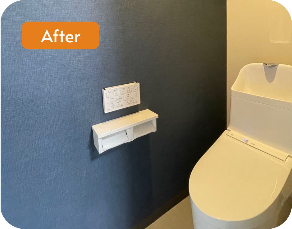 さらに、古くなっていたトイレもリニューアルし、使い勝手の良いミニキッチンも設置。快適に過ごせる事務所空間へと仕上がりました。
