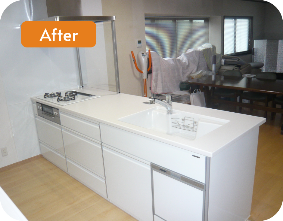 壁がなくなったことで実際の広さ以上に広がりを感じられるようになり、自然光も奥まで届き、より明るいキッチンに生まれ変わっています。